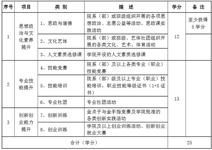 学院发布第二课堂行动指南,指导学生规范参加第二课堂学习,第二课堂学分设置25学分,学分设置如下: