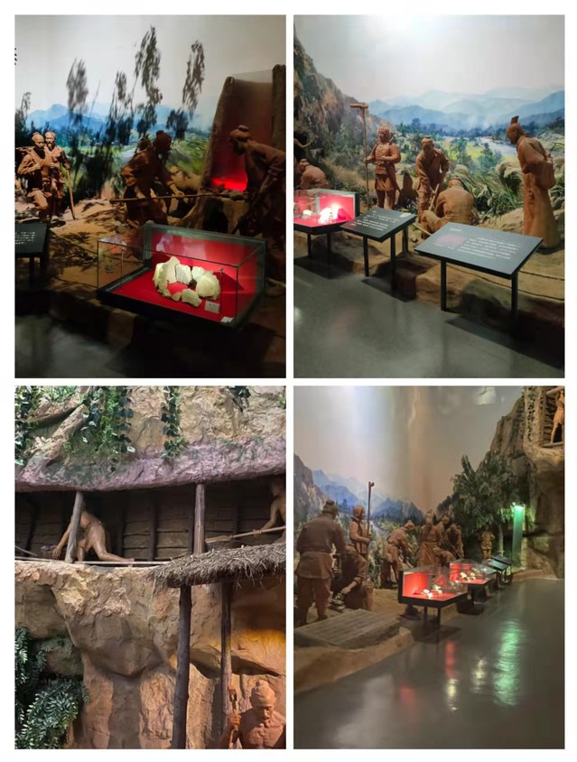 “沧海巨变,铜脉溯源”,往里深入了解,是金牛洞古采矿遗址的部分复原场景。场景中,“矿工们”有条不紊地进行着找矿、露采、坑采、提升、冶铸。旁边展示了蓝铜矿、黄铜矿、自然铜,孔雀石等具有经典代表性的矿石标本。