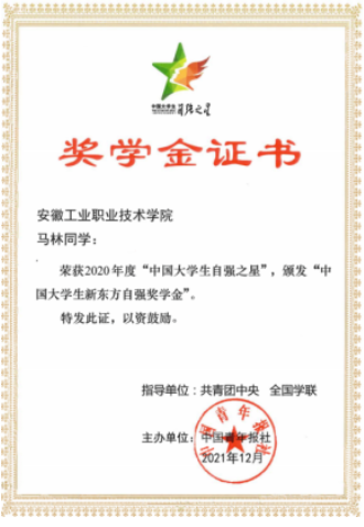 近日,由共青团中央、全国学联指导,中国青年报主办的2020年度寻访“中国大学生自强之星”奖学金活动评选结果揭晓,金年会马林同学荣获2020年度“中国大学生自强之星”。