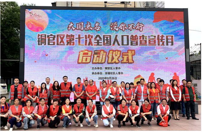 图为马林同学与其他志愿者在幸福社区参加第七次人口普查启动仪式合影