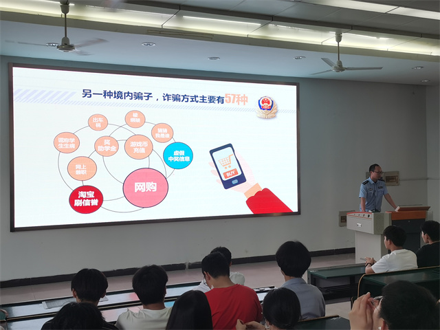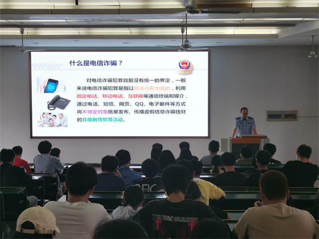 讲座中,陶警官从什么是电信诈骗、电信诈骗的形式与种类、与校园相关的电信诈骗、其他常见的电信诈骗、电信诈骗防范常识和如何打击诈骗六个方面揭示了电信诈骗的真面目。通过鲜活的案例,详细讲解了网络诈骗、校园贷诈骗、兼职刷单诈骗、购物退款诈骗、发放助学金诈骗、仿冒熟人领导诈骗、机票改签诈骗等金融诈骗的类型、产生的危害及解决措施,引发了同学们对电信诈骗危害的重视和思考。陶警官表示,大学生涉世不深,缺乏必要的社会经验,极易被诈骗分子所利用,落入诈骗分子的陷阱,因此大学生要从自身做起,勿信天上掉馅饼,勿点不明链接。