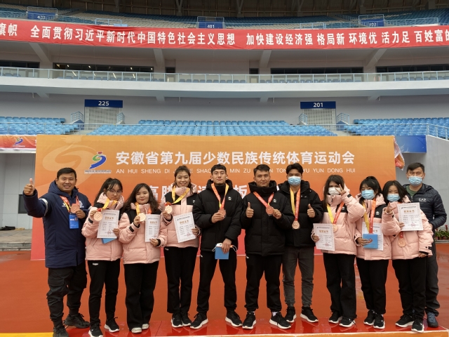 本届运动会为安徽省第九届少数民族体育运动会,赛程5天,从11月25日至29日在滁州市举行,设武术、民族式摔跤、毽球、高脚竞速、板鞋竞速、陀螺、押加、蹴球8个竞赛项目和民族健身操表演项目,来自全省16个代表团、800多名运动员将展开各类奖项的角逐。金年会热夏提·木沙江、木艾热木·托乎提等11位少数民族学生代表铜陵市参加了运动会。其中男子押加项目85kg+以上级取得银牌,男子押加项目61kg级,女子板鞋竞速2x100米接力项目取得铜牌,2名学生荣获“道德风尚奖”。