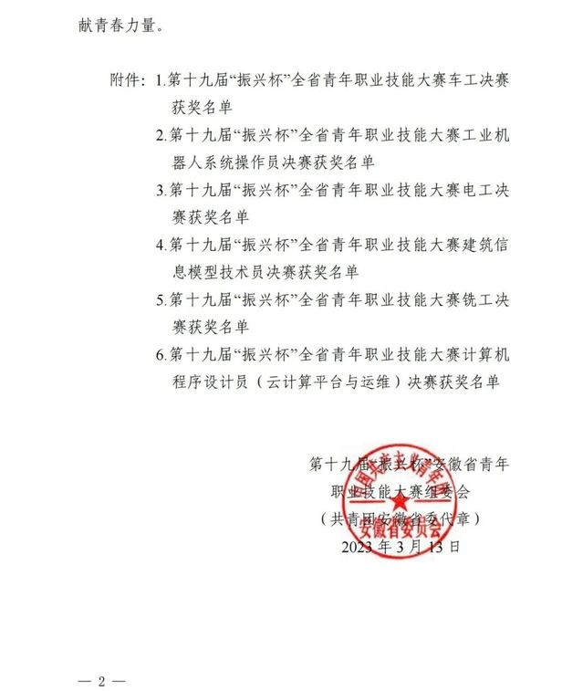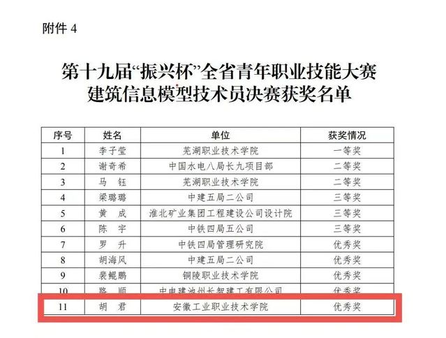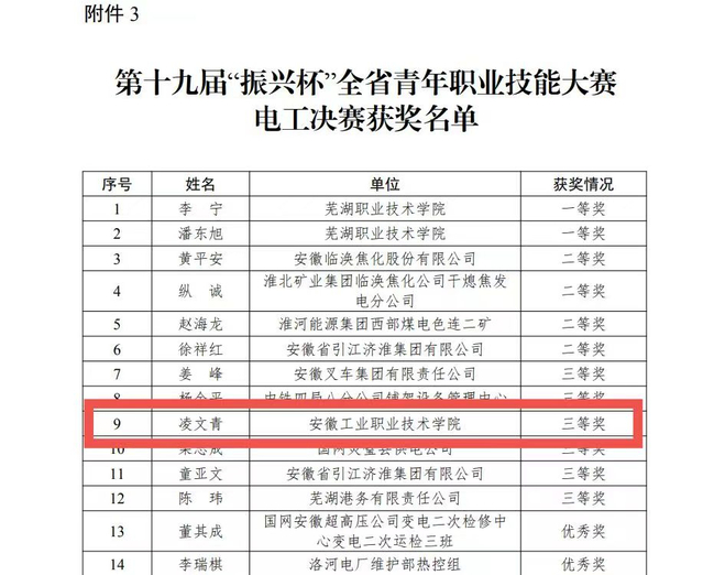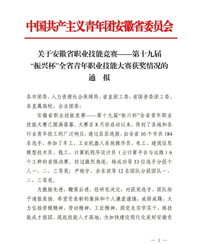 近日,由共青团安徽省委员会举办的第十九届“振兴杯”青年职业技能大赛落下帷幕。机电工程学院凌文青老师和资源开发系胡君老师分别荣获三等奖和优秀奖的佳绩。