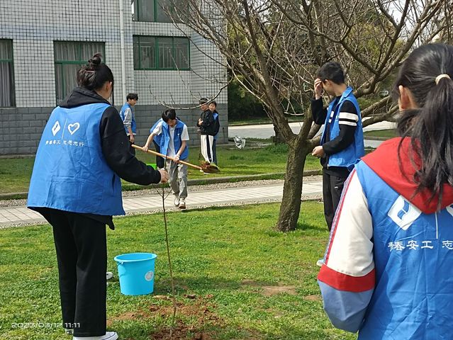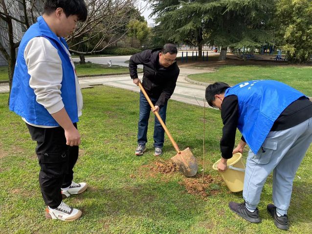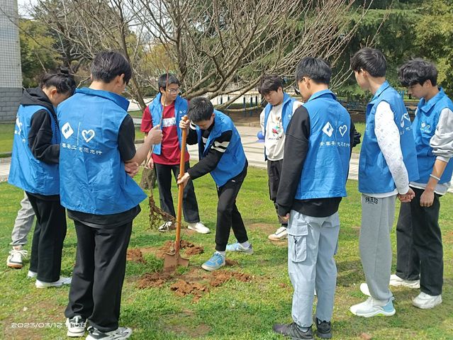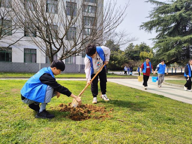 同学们积极参与,热情高涨,植树的过程中,大家分工合作,有的挖坑、有的扶树苗、有的浇水…… 一眨眼的功夫,在同学们的辛勤劳动下,树苗便“亭亭玉立”在沃土上。虽然大家脚底全是泥土,但眼前这一片新生的春意让大家满心欢喜。同时也在校园中营造了和谐温馨的氛围。
