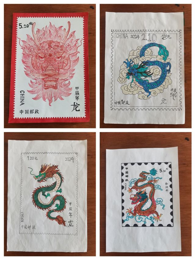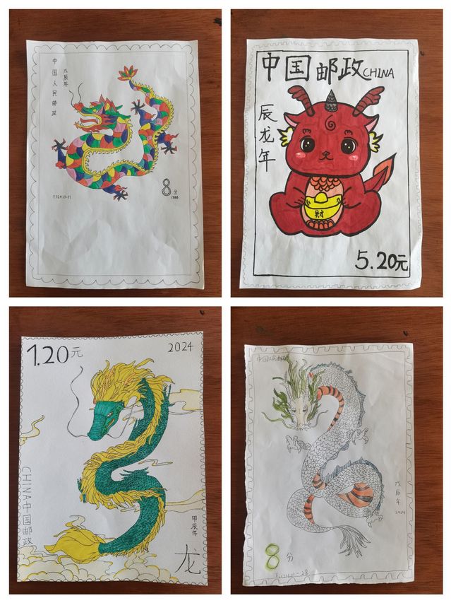 活动过程中同学们发挥想象力和绘画能力,利用不同线条勾绘出龙的模样,使用马克笔进行上色,方寸纸上,每一张邮票都别出心裁。各种各样的龙,变的栩栩如生。