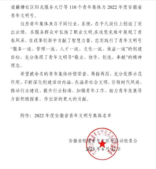据悉,此次被命名为安徽省青年文明号的青年集体来自不同行业、系统,在平凡岗位上创造了突出业绩,在服务群众中弘扬了职业文明,在攻坚克难中展现了青春风采,在改革创新中贡献了智慧力量,忠实践行了青年文明号“服务一流、管理一流、人才一流、文化一流、效益一流”的创建目标,充分体现了青年文明号“敬业、协作、创优、奉献”的精神理念。