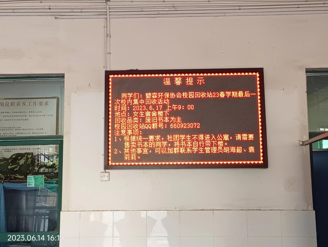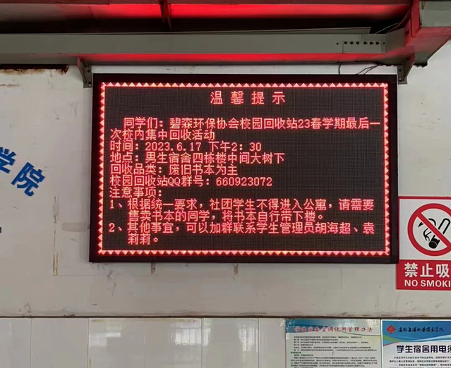 23春季学期即将结束,为解决21级离校学生的实际售卖需求,碧森环保协会校园回收站开展了本学期最后一次大规模校内回收活动。活动开始前,社团指导教师王小英提前在保卫处报备本次活动相关事宜,并在宿管办的支持和配合下,在男生公寓和女生公寓的一楼电子大屏上提前进行通知。