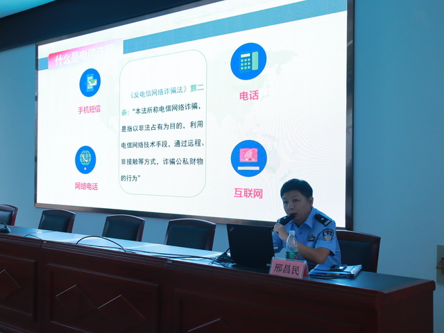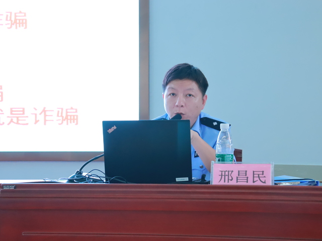 活动伊始,市公安局反诈中心教导员邢昌民主任就“为什么要宣传防范电信网络诈骗”“什么是电信网络诈骗”等问题作了详细讲解,并结合案件深入浅出地向同学们讲述了如何防范电信网络诈骗。邢警官幽默生动的语言,详实清楚的介绍,为同学们带来了一场精彩的反电诈宣传讲座。