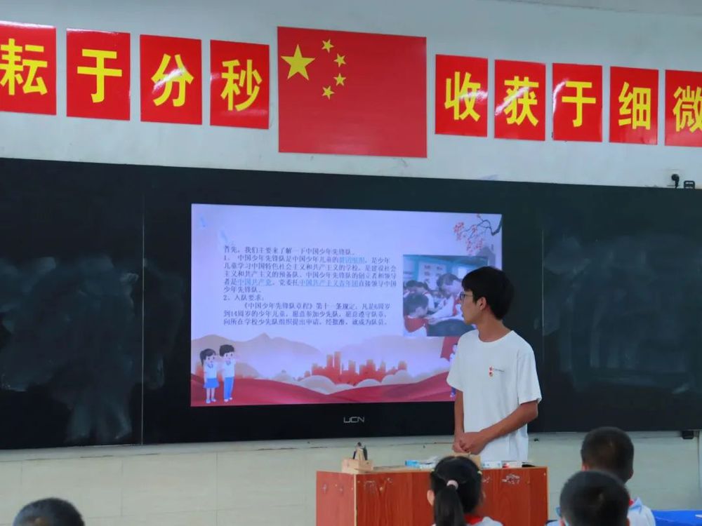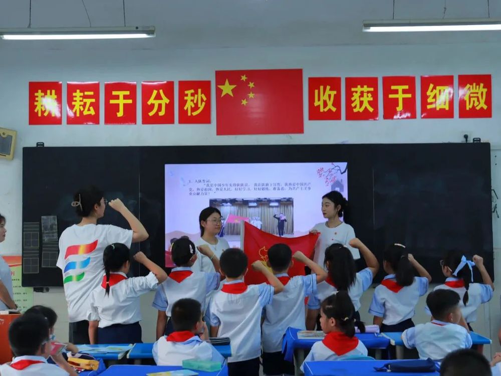 活动开始,实践队员带领少先队员们共同学习了习近平总书记关于“入队、入团、入党,是青年追求政治进步的‘人生三部曲’”的重要寄语,少先队员们重温了入队知识,了解红领巾的由来,分享入队感悟,增强了少先队员对少先队组织的光荣感、归属感。