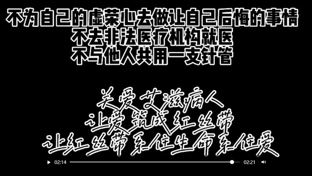 活动以小组为单位,四人一组合作拍摄此视频,视频内容讲述着艾滋病的危害以及如何预防艾滋病,艾滋病的蔓延,严重威胁人民群众的生命财产安全,严重威胁着社会的可持续发展。艾滋病的不可治愈性与快速蔓延形势引起了社会各界及各国政府的高度重视。