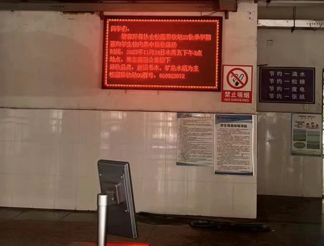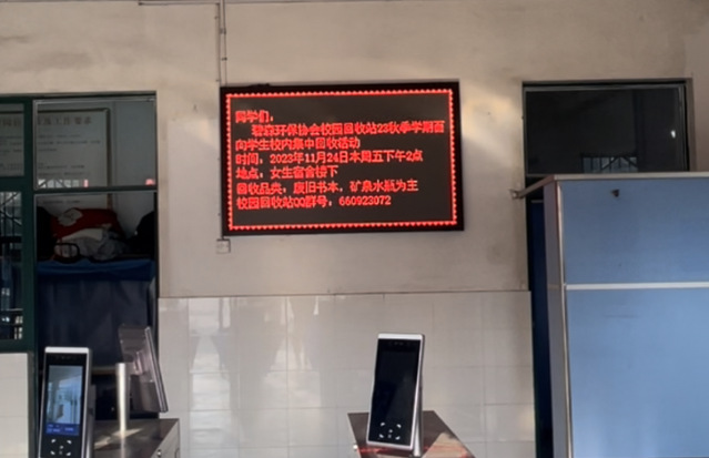 2023年11月24日下午,碧森环保协会分别在女生公寓和男生公寓楼下开展了本学期第三次校园回收活动。活动开展前,社团指导教师提前跟学院保卫处报备,并与宿管办沟通,在女生公寓和男生公寓楼下大屏上进行宣传告知。