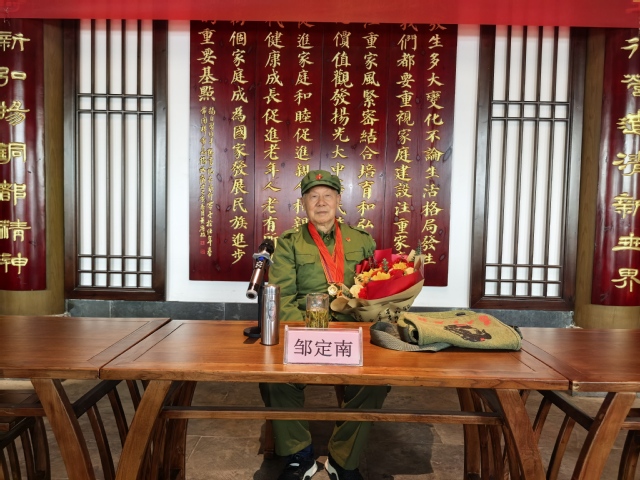 祭扫活动结束后,学院邀请抗美援朝老兵邹定南老先生,开展了一场别开生面的抗美援朝故事分享座谈会。座谈会现场,邹定南老先生精神矍铄,目光中透露出坚毅。他用质朴而生动的语言,深情讲述了亲身经历的战斗场景。在冰天雪地、物资匮乏的环境下,邹老和战友们不畏强敌,浴血奋战。他回忆起与战友们同生共死的场景,深情地描述着战友间深厚的情谊。一个个真实的故事、一段段难忘的经历,让在场的师生仿佛穿越时空,置身于硝烟弥漫的战场。