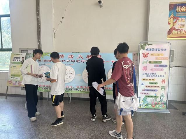 “五感寻幸福”搜集活动成为本次心理健康月的创新亮点。学生们手持特制手册,通过“寻找会飞的物品”“记录闻起来香甜的瞬间”等15个趣味任务,用视觉捕捉校园光影、用触觉感受草木纹理、用文字记录味觉记忆。活动回收的近百份手册中,既有粘贴着合欢花、奶茶杯贴纸的“实物宝藏”,也有“毛茸茸的小猫咪”“雨后青草香”等细腻文字描绘。特别设置的“送给自己的礼物”反思栏,更让学生在探索外在美好的同时,学会关照内心需求,实现个人疗愈与集体温暖的双向传递。 在教学楼大厅,“情绪大转盘”互动展板吸引了众多学生驻足。展板以“觉察-命名-接纳-调节-行动”五步法为核心,结合可旋转的“情绪应对策略”装置,将抽象的心理学知识转化为“数呼吸法”“优势日记”等具体操作。“原来愤怒时可以通过写‘情绪信’释放!”“转动转盘像开盲盒一样有惊喜”——同学们的反馈印证了活动的实效性,让情绪管理从理论走向可感知、可操作的日常实践。