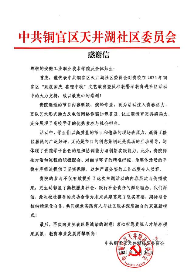 近日,学院收到了来自中共铜官区天井湖社区委员会的感谢信,对学院在2025年铜官区“欢度国庆 喜迎中秋”文艺演出暨反邪教警示教育进社区活动中的积极参与和出色表现表示衷心感谢。