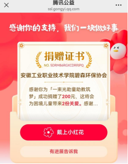 安工学院碧森环保协会由一群热爱生活、热爱自然、热爱公益的在校生于2007年11月自发成立,长期利用课余时间开展垃圾分类宣讲、校园环保实践、笔架山护林团建、废旧书本回收等活动。协会坚持‘让环保成为习惯’的理念,用青年视角把绿色种子播进同学们心田。此次捐款前,社员们通过校园回收站回收废旧纸箱、塑料瓶筹集经费。200元虽微,却浓缩了成员们的环保实践汗水,也标志着碧森环保协会首次把公益延伸到校外专业组织,实现从校内倡导到社会支持的跨越。协会后续会将‘回收收益捐赠’写入章程,目标每学年至少完成一次校外公益资助,让绿色与公益的纽带在青年学子手中持续延伸。(撰稿:王小英 审核:彭林)