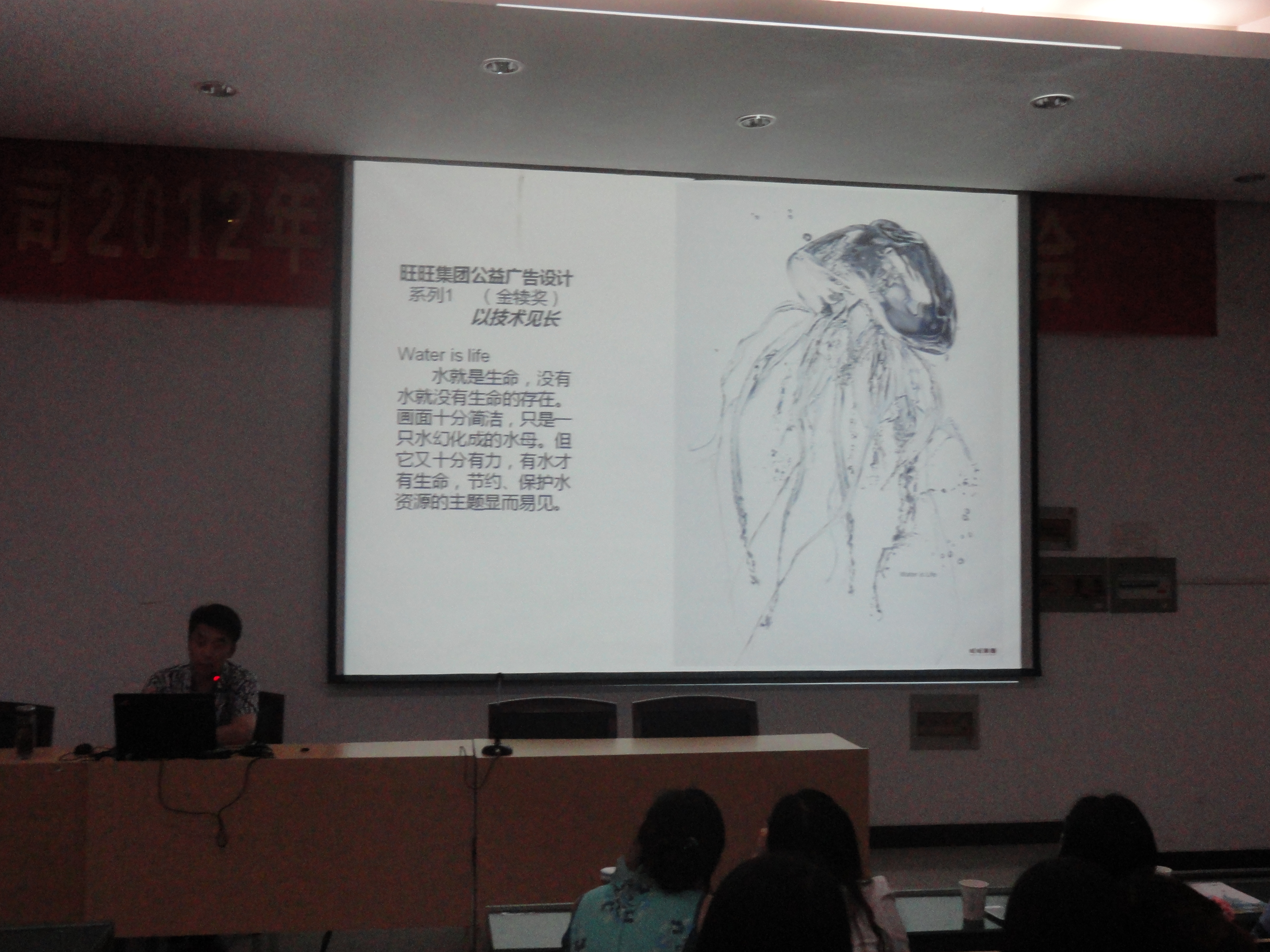 晚上7点,随着同学们热烈的掌声,首先由王忠 教授带来关于大广赛的介绍,并用自己丰富的专业知识给同学们上了一堂关于创意的课。在上课的同时,给同学们带来了一些小礼品。同学们的参与热情空前高涨。随着精彩幽默的演讲,同学们也报以热烈的掌声。王宜川 教授带来了台湾金犊奖的获奖作品,并和同学们一起分享了这些创意。王 教授通过每幅作品向同学们介绍了这些创意形成的过程,从而启发同学们能够从不同的角度来构思作品。