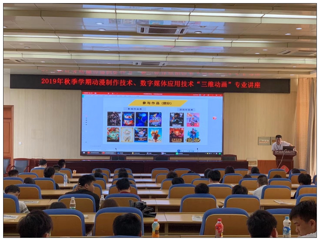17动漫、数媒专业和艺术设计教研室全体教师参会,两个多小时的讲座,现场座无虚席,同学们展现了对新知识、新技术的渴求。陶亮等三位动画师从剧本、故事版、分镜、预演、绑定等多方面给同学们做了一场精彩的讲座。