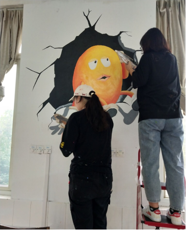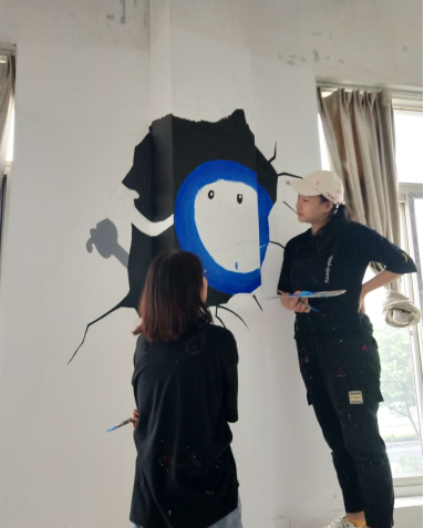 绘制进行时,社员们都拿着画笔和调色盘,小心翼翼的上色,身上都无一不是五彩斑斓的;正所谓艺术是有型的,也是无形的。在大家的努力下,白白的墙体和墙柱逐渐鲜活了起来,墙柱上的鱼儿,仿若将要游出来一般;墙体上的3D图画,异常逼真。