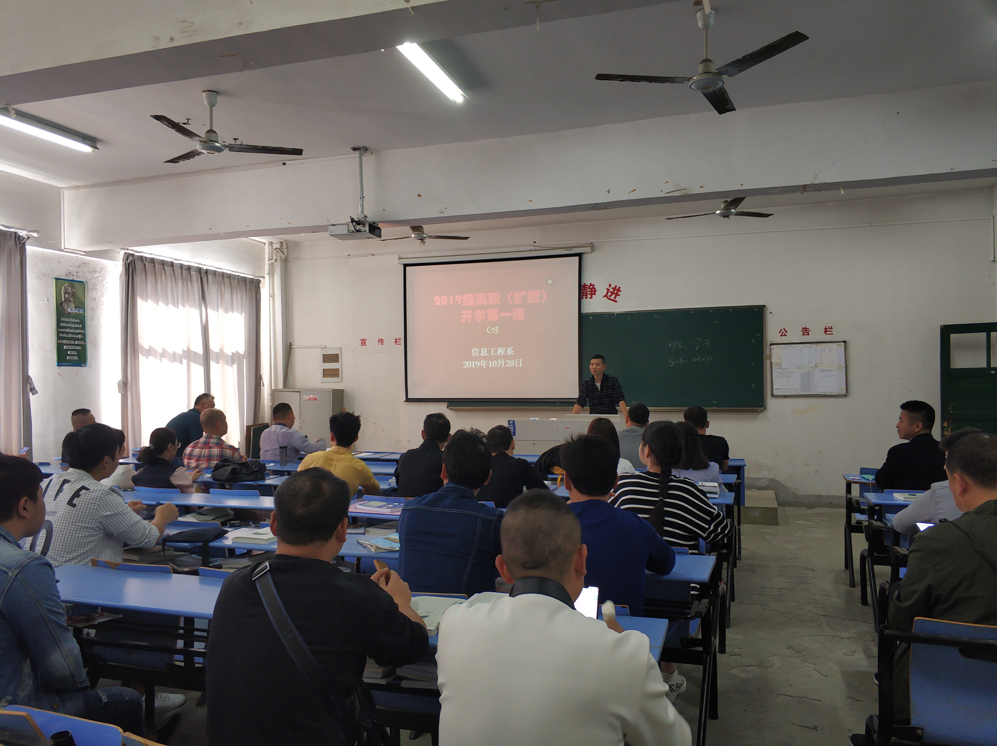 2019年10月20下午两点,在图文信息楼501教室迎来了一批不一样的同学,他们就是2019年高职扩招班的同学们。信息工程系组织了一场特别的欢迎动员会――“开学第一课”,系主任、书记、部分专业带头人和辅导员老师参加了动员会。
