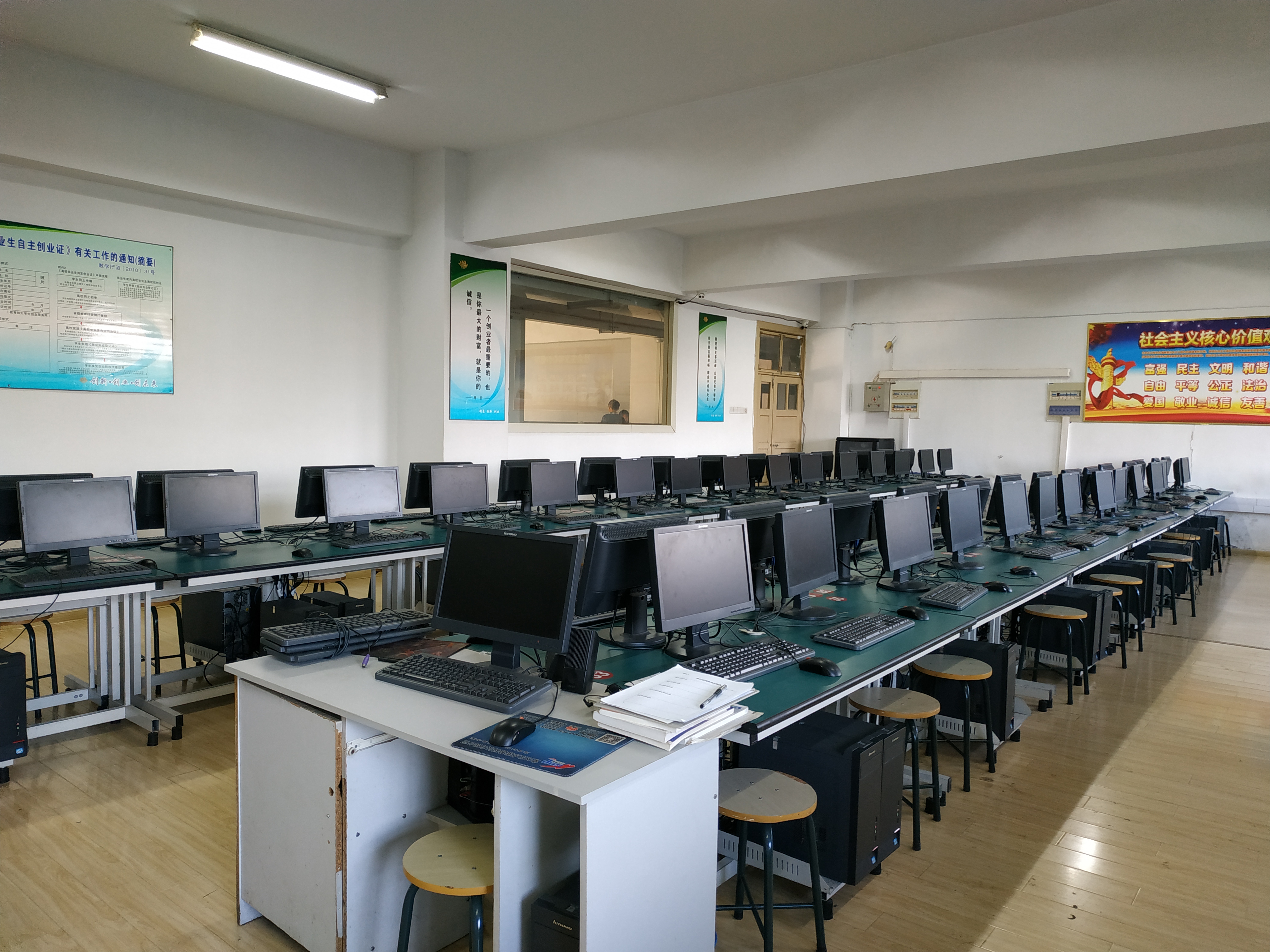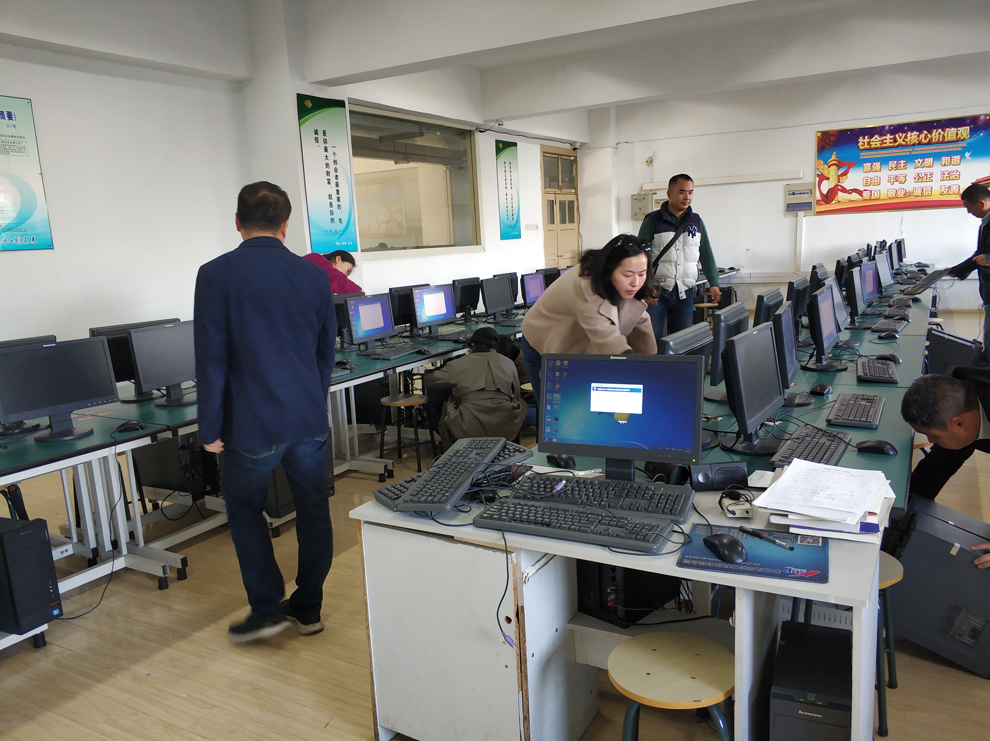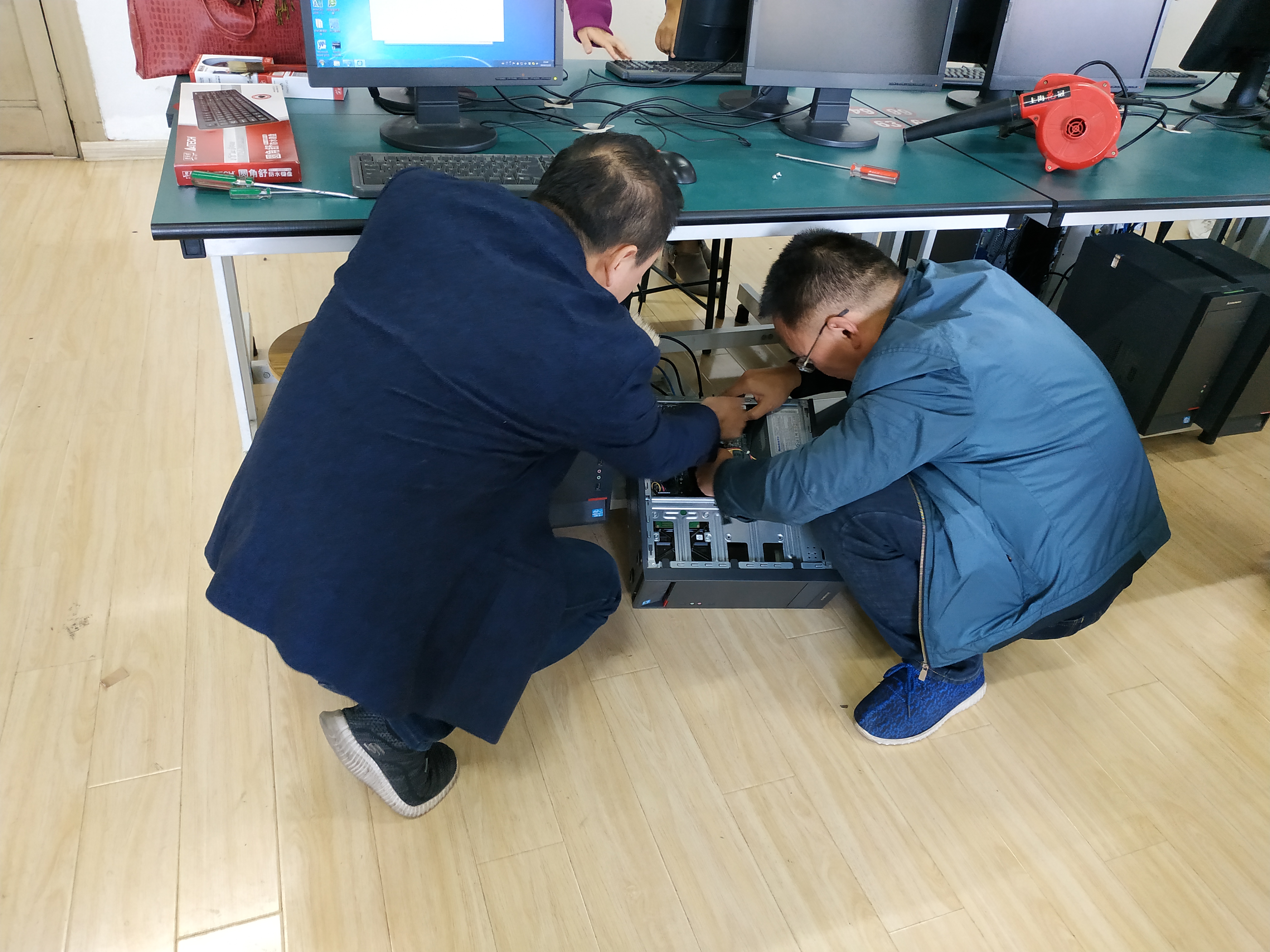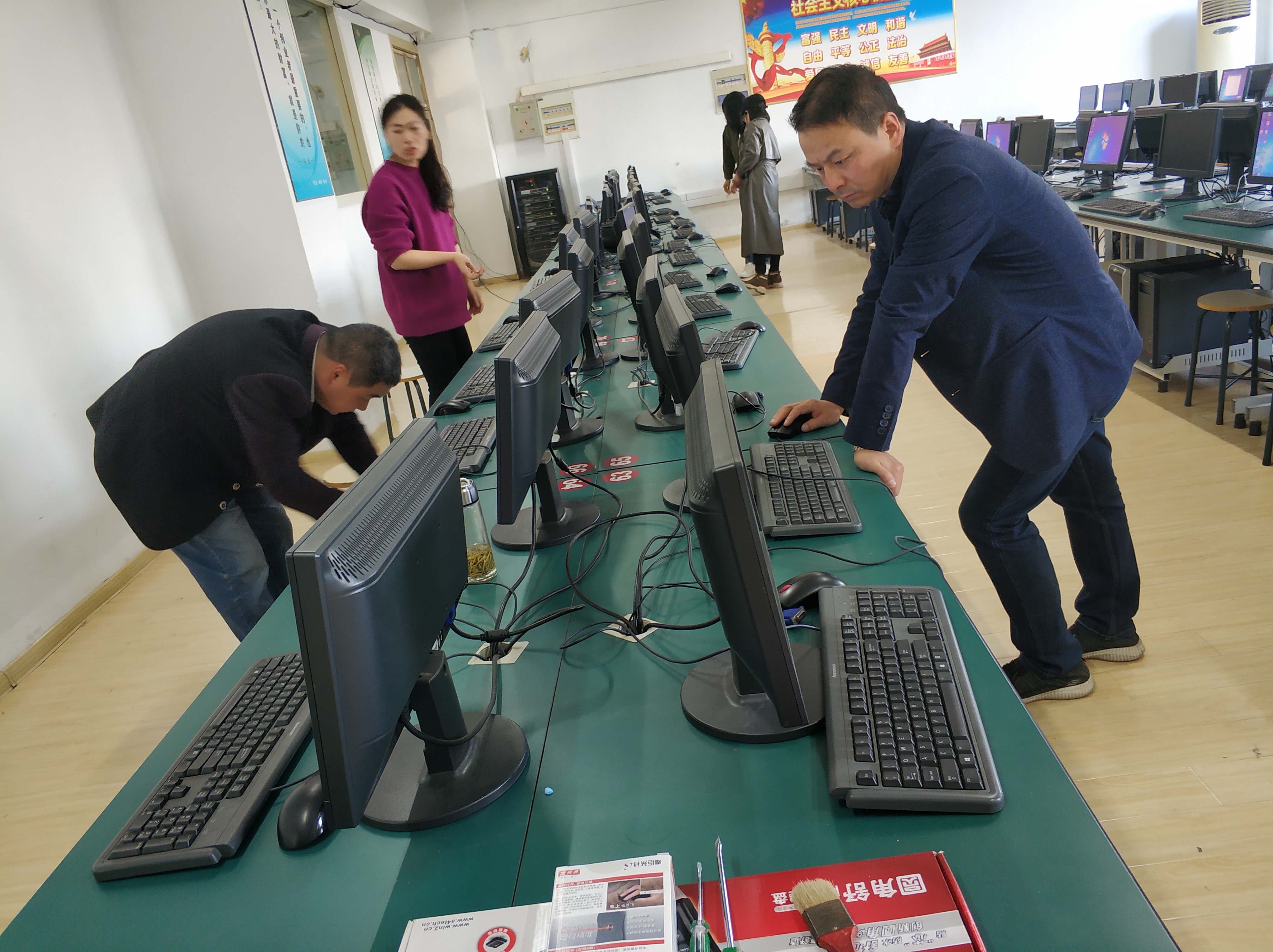 党员同志们对机房的卫生进行了整理与清扫,包括对桌面损坏的鼠标,键盘进行清理及更换,逐个检查机房电脑,对问题电脑进行设备维修确保教学设备的正常运转,最后对机房卫生进行了清理,给学生提供了一个良好的学习环境。