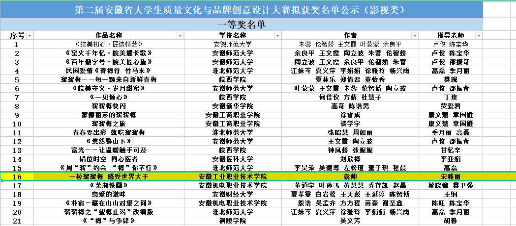 第二届安徽省大学生质量文化与品牌创意设计大赛共征集公益类、平面类、视频类、动画类、广播类、文案类、策划类、文创类作品11090件。金年会信息工程系在本赛项中积极申报、认真组织,选送作品参赛,经过高校、企业和政府职能部门专家、学者严谨细致的初评和终评,最终由宋雅丽老师指导、20数媒班的袁帅同学的影视作品“一粒溜溜梅 感受世界大千”在众多作品中脱颖而出,获得影视类一等奖。