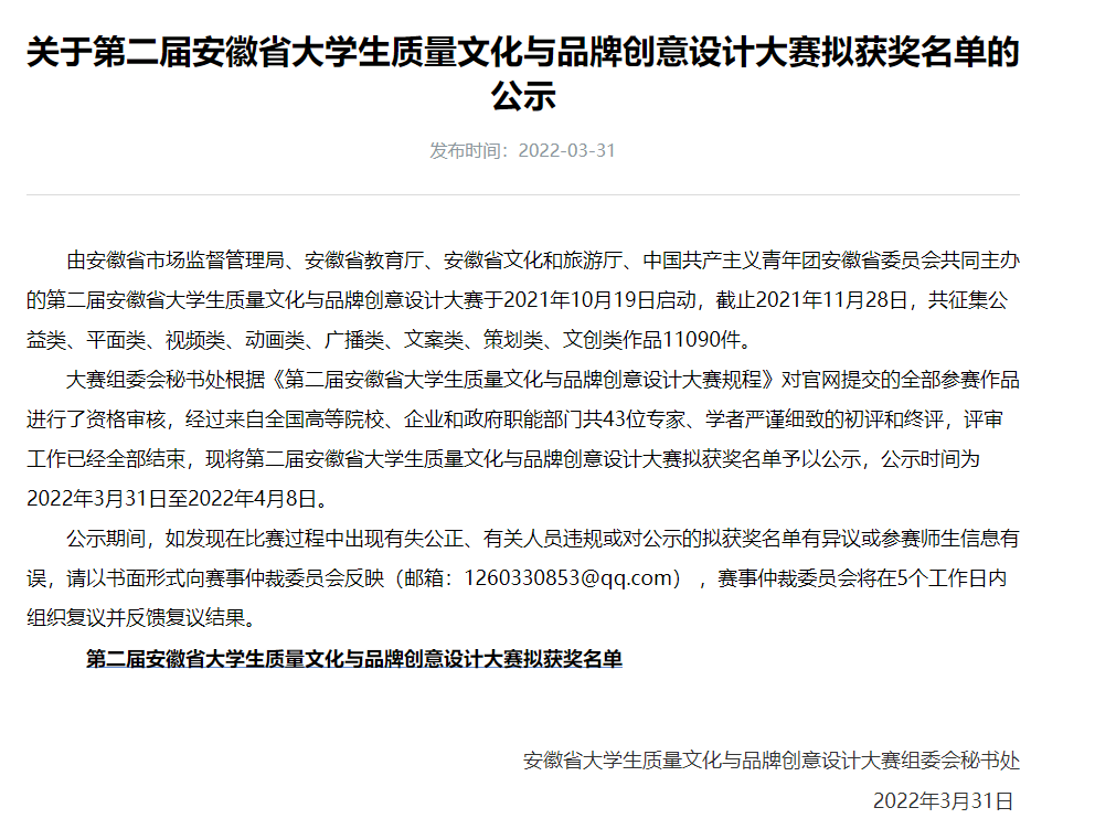 安徽省大学生质量文化与品牌创意设计大赛由安徽省市场监管局、省教育厅、省文化和旅游厅、团省委共同主办的具有指导性、示范性、权威性以及群众性的文化创意设计大赛,旨在汇聚创意设计资源,搭建交流协作平台,促进创意成果转化,推动文创与产业融合发展。