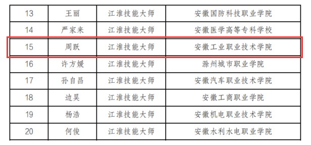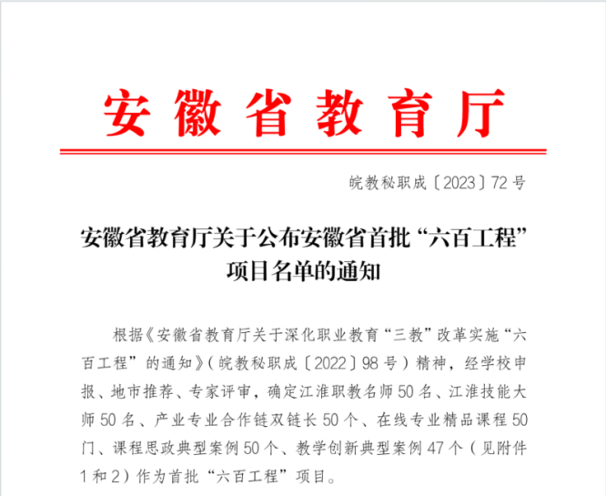 2023年12月6日,安徽省教育厅发布了《安徽省教育厅关于公布安徽省首批“六百工程”项目名单的通知》,信息工程系周跃老师光荣入选安徽省职业院校“江淮技能大师”。