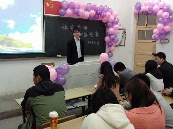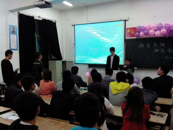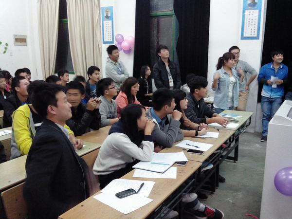 2013年10月30日晚7点,为加强学风建设、丰富和活跃校园文化生活,激发同学们学习英语的兴趣,展现当代大学生的青春风采,健康与活力,我校资源开发系学习部在教学楼106室举行了“趣味英语活动”。本次活动以分组PK的形式展开。参加活动的主要是本系的大一新生,活动以“听、说、读、写”四个环节组成,活动中的各小组相互讨论。现场气氛活跃,参与者表现积极。