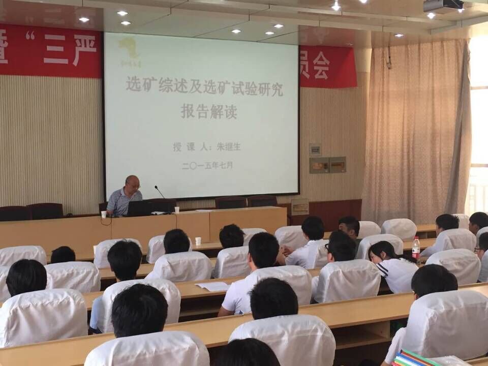朱继生高工的讲座主要介绍选矿的生产流程及生产试验这两大方面, 首先,他向我们师生简单介绍选矿历史、选矿理论、作用及其重要性;其次,他强调了选别前的准备作业、选别作业、产品处理以及选矿过程自动控制这四个重要的生产工艺过程。同时,他还指出生产试验在选矿厂中的地位,详细介绍了试验所需药剂、试样分析研究、矿物组成研究、嵌布粒度特性研究等多方面的研究。随后,他还细心的向我们解读了试验研究报告,为我们提供多个公司的试验研究结果,给了我们在座的师生很大帮助。