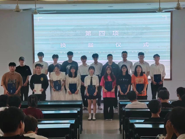 随后便开展了23届学生会换届大会,为感谢22届学生会干部与主席的付出,对其颁发聘书并合影,在宣读23届学生会干部与主席的职责后,由22届学生会干部为23届学生会干部佩戴胸牌完成换届。