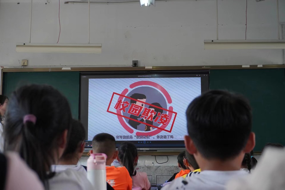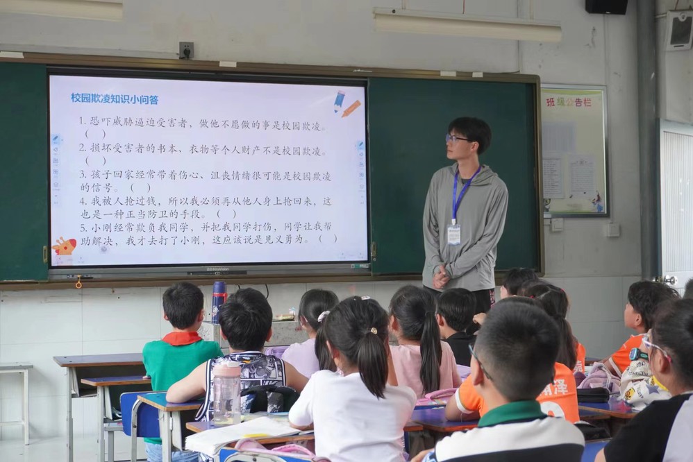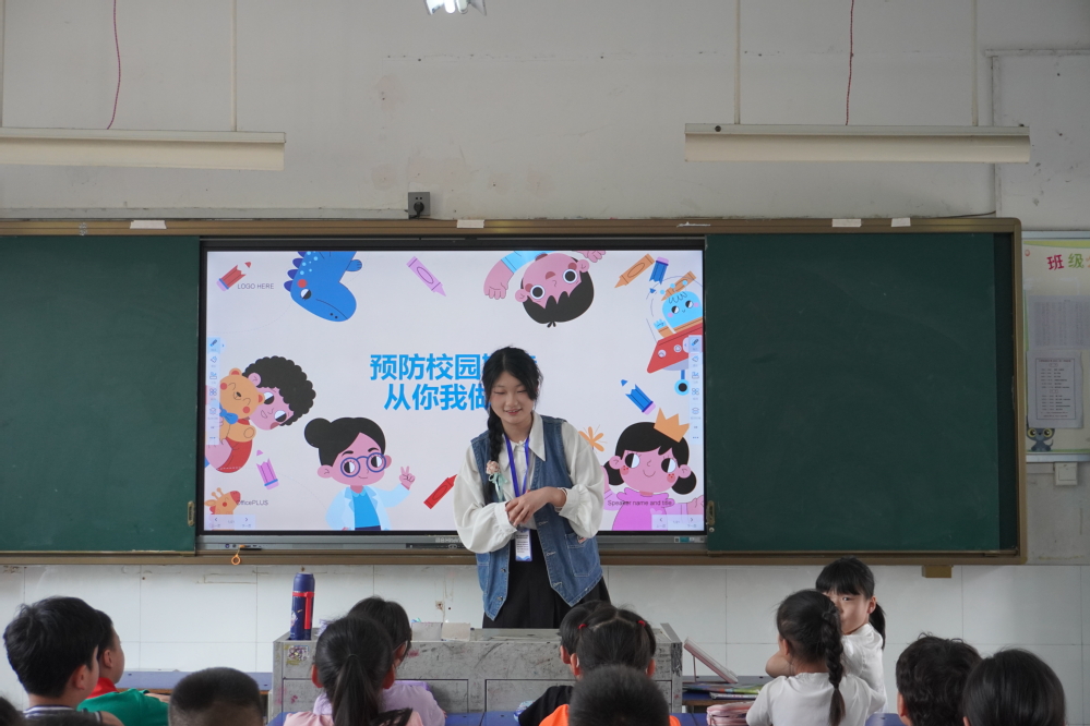 活动一开始,演讲与辩论协会、资源开发系代表吴梓敏利用一段校园欺凌的视频将同学们拉入情境,寓教于乐地向学生们讲述日常学习生活中信任与防范意识是并存的。之后,根据在校学生的年龄心理特点,采用PPT讲解、以及资源开发系代表吴承超现场提问互动等方式,生动形象地解释了什么是校园霸凌、校园霸凌的类型及危害。同时,通过与孩子们的互动,也给他们带去了很多小礼物。