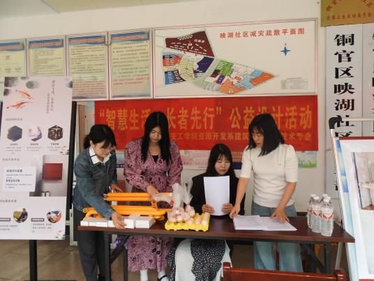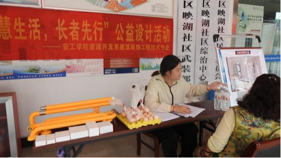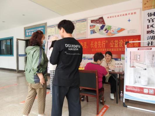 在活动举行的当日,映湖社区呈现出一片热烈的氛围。来自资源开发系建筑装饰专业的师生们精心设置了专业摊位,旨在充分展示其针对老年人生活需求的系列创新设计成果。这些成果包括但不限于无障碍家居改造方案、智能健康监测设备以及便捷生活辅助工具等,每一项都体现了对老年人生活品质的深度关怀与细致思考。