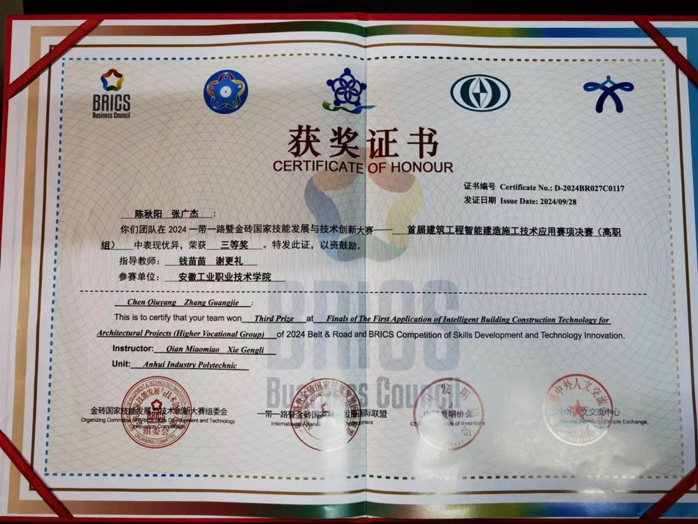 2024年9月26至28日,2024一带一路暨金砖国家技能发展与技术创新大赛首届建筑工程智能建造施工技术应用赛项全国总决赛在杭州圆满落幕。经过激烈角逐,资源开发系陈秋阳和张广杰同学在高职组中表现优异,获得三等奖。