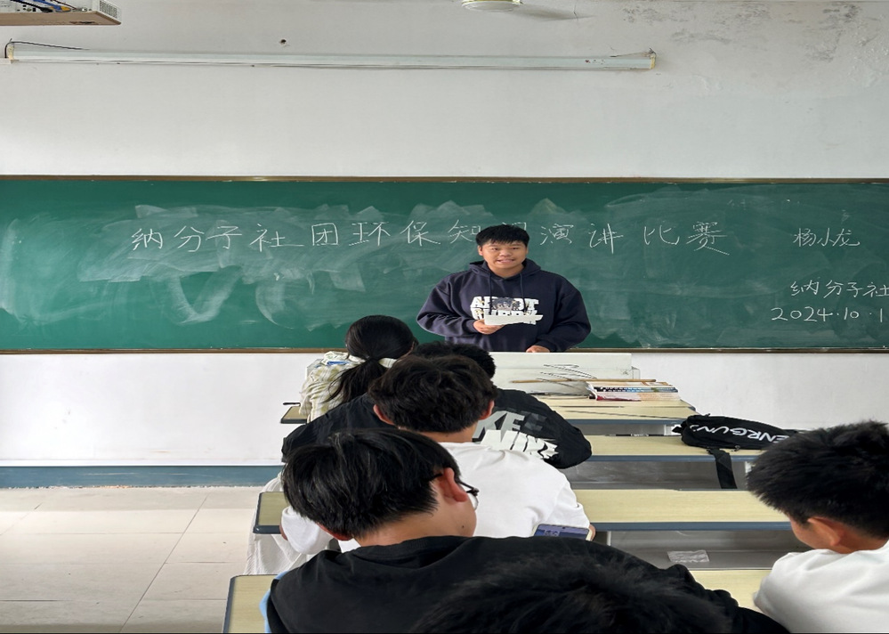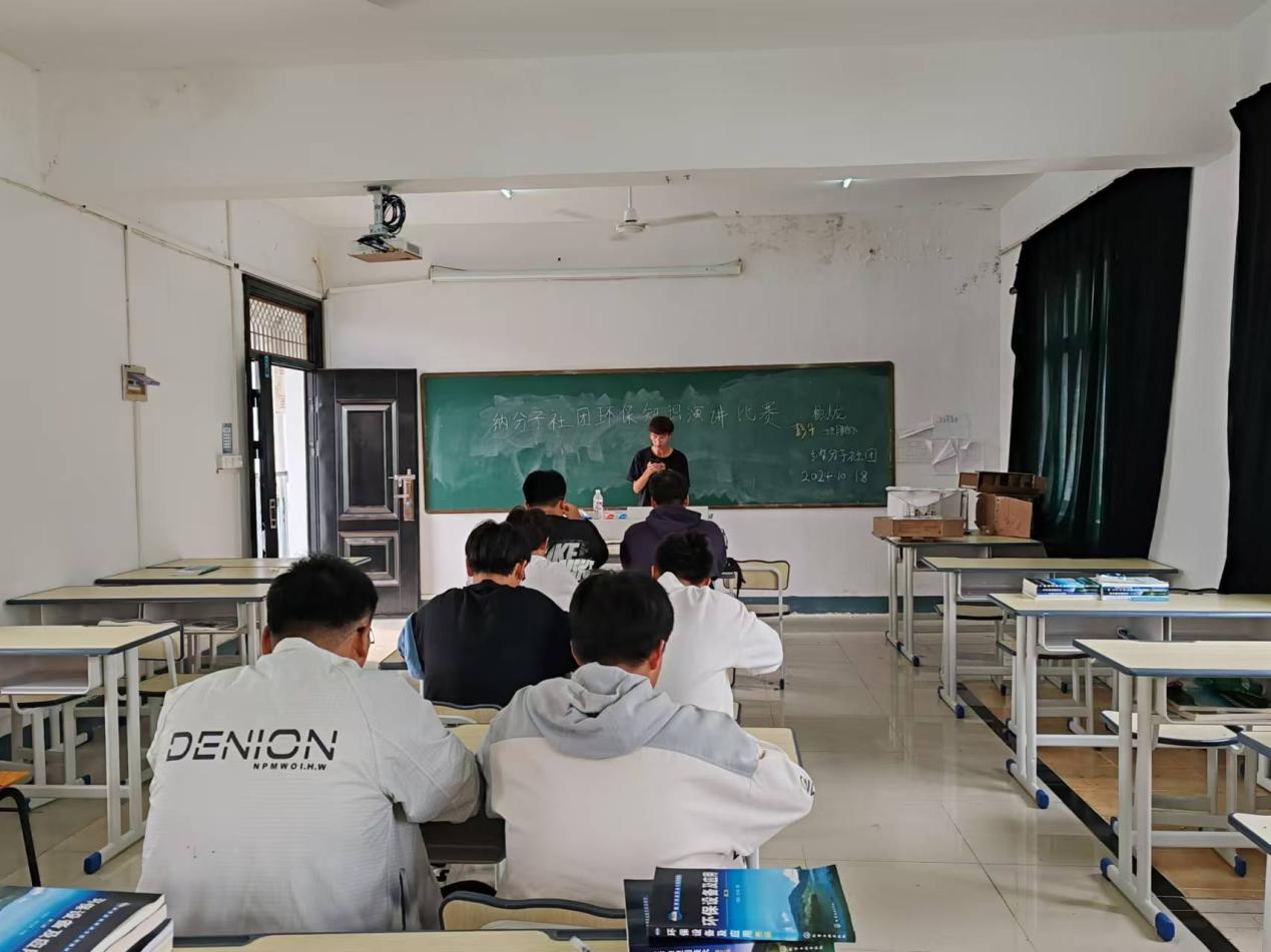 2024年10月18号下午,为提高公众对环保问题的认识,倡导绿色生活方式,纳分子社团在总务楼302教室举办了环保知识演讲比赛。