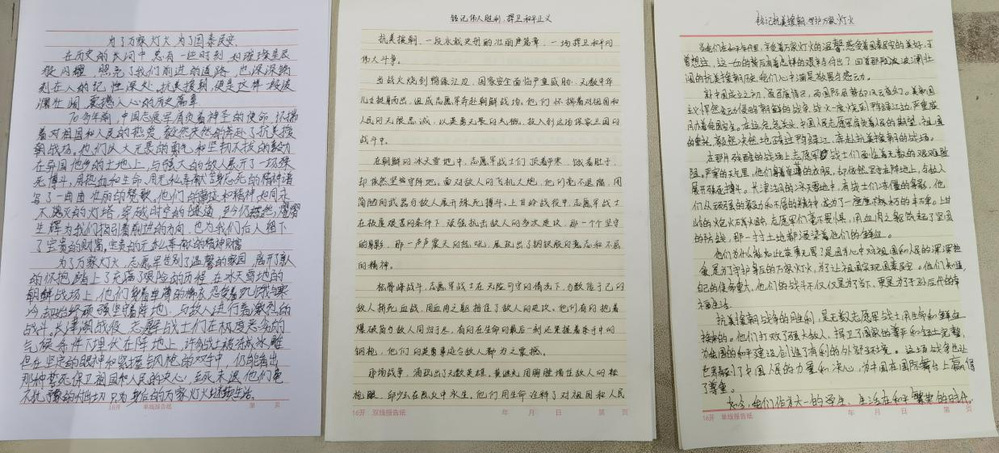 活动中收到的征文质量颇高,内容丰富同学们以真挚的情感描绘出抗美援朝战场上支援军战士们的英勇身姿无论是在冰天雪地中坚守阵地,还是在枪林弹雨中冲锋陷阵,都跃然在纸上。有的征文深入分析了抗美援朝战争对于新中国国际地位和民族自信心的重大意义,展现出同学们深刻的思想。