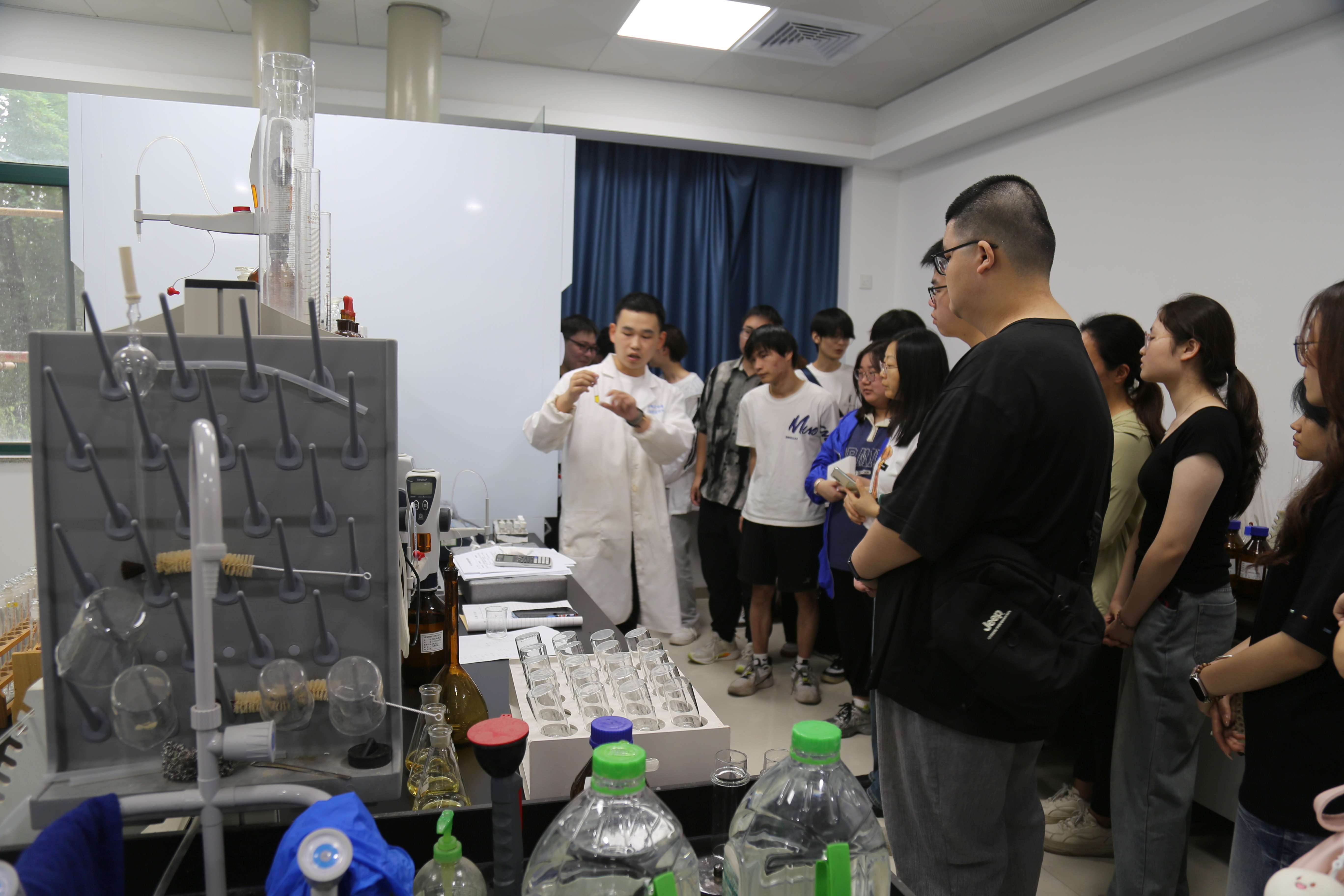 化验分析室参观:在中心负责人带领下,学生前往中心四楼化验分析室,由中心监测分析室工作人员方铜春现场操作演示全自动COD测定仪,讲解仪器工作原理和样品分析过程。