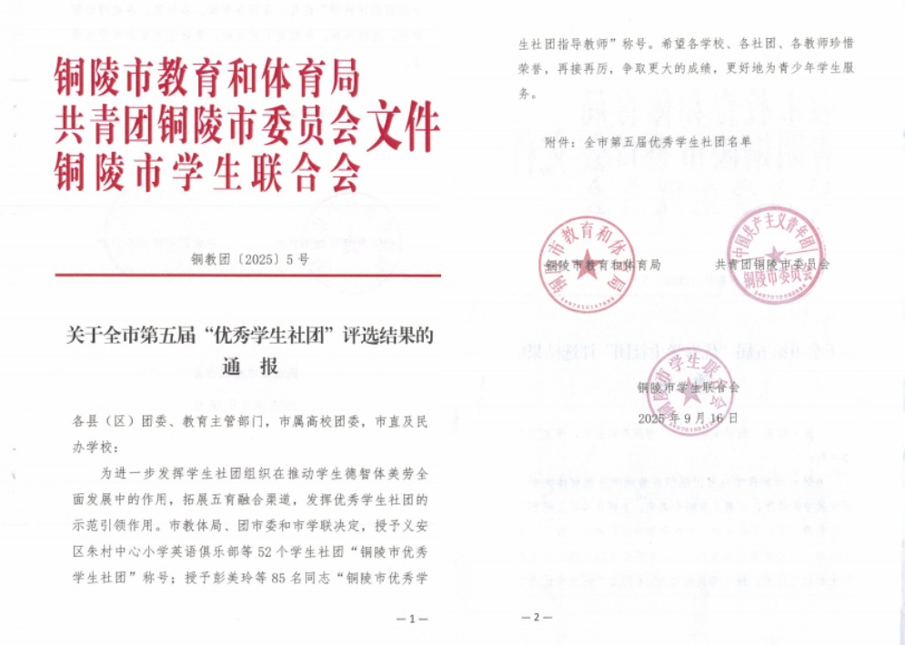 近日,铜陵市教育和体育局、共青团铜陵市委员会、铜陵市学生联合会联合发布了《关于全市第五届“优秀学生社团”评选结果的通报》(铜教团〔2025〕5号),金年会jinnianhuicom纳分子社团凭借其突出的社团建设成果和广泛的育人成效,荣获“铜陵市优秀学生社团”荣誉称号。