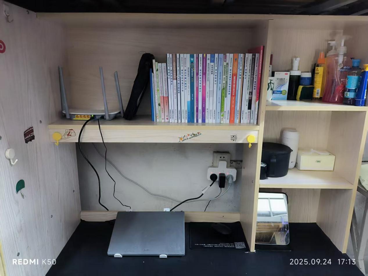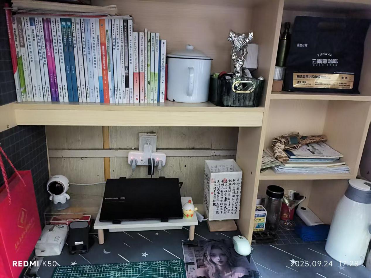 活动启动以来,各宿舍成员分工协作、集思广益,围绕“安全、整洁、创意、温馨”四大核心要求展开设计。有的宿舍以“星空”“森林”为主题,用串灯、绿植、手绘墙营造沉浸式氛围;有的宿舍融入专业特色,将机械零件、书画作品、实验模型巧妙装饰,展现学科魅力;还有的宿舍以“环保”为理念,利用快递盒、旧报纸等废旧材料制作收纳盒、装饰画,既低碳又充满巧思。从桌面的整齐收纳到墙面的个性布置,从窗台的绿植点缀到角落的温馨标语,每一处细节都彰显着同学们对生活的热爱与对“家”的用心。