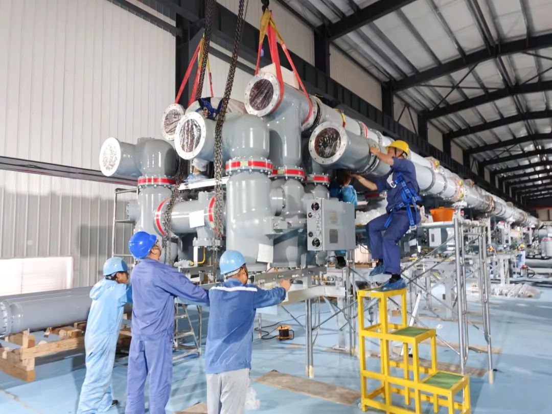 作为平高电气供货的第二个深圳地区5000A的重点项目,平高电气对本项目从设计到现场安装7大阶段实施质量控制,梳理确定20个关键项目,共制定63条质量控制措施,全部落实到制造履约表、检查卡中,并策划现场安装组织机构和安装实施方案,切实保障产品全过程、全方位高质量生产和安装,为产品顺利通过耐压,安全稳定投运奠定基础。产品质量控制从设计源头把控,用高质量设计践行高质量发展。主母线采用额定电流5000A,快速接地开关满足超B类要求,断路器、隔离开关、接地开关机械寿命10000次,断路器三相机械联动机构箱采用优化设计方便巡视观察需要。为保证现场安装质量,根据产品结构特点,设计专用的导电杆运送小车,能够满足将加长导体从法兰口处一次装入筒体中的需求。小车采用尼龙轮和尼龙支撑板,移动过程不会损伤筒体和导体,并配备牵引线,方便装配后取出。安装后的导电杆配备专用托板,能够有效托举导体,并在接触位置采用硅胶材质,防止在吊装过程中磕碰导体。间隔对接调整处配备的“牛眼轮+超低千斤顶”工装,可整体放置在间隔下方,能够实现对接过程中平稳移动。对接后只用进行微小调节,待对接到位时,稍稍顶起间隔,可实现顺利对接,避免吊装过程晃动而引起的磕碰、绝缘件碎裂等异常情况。