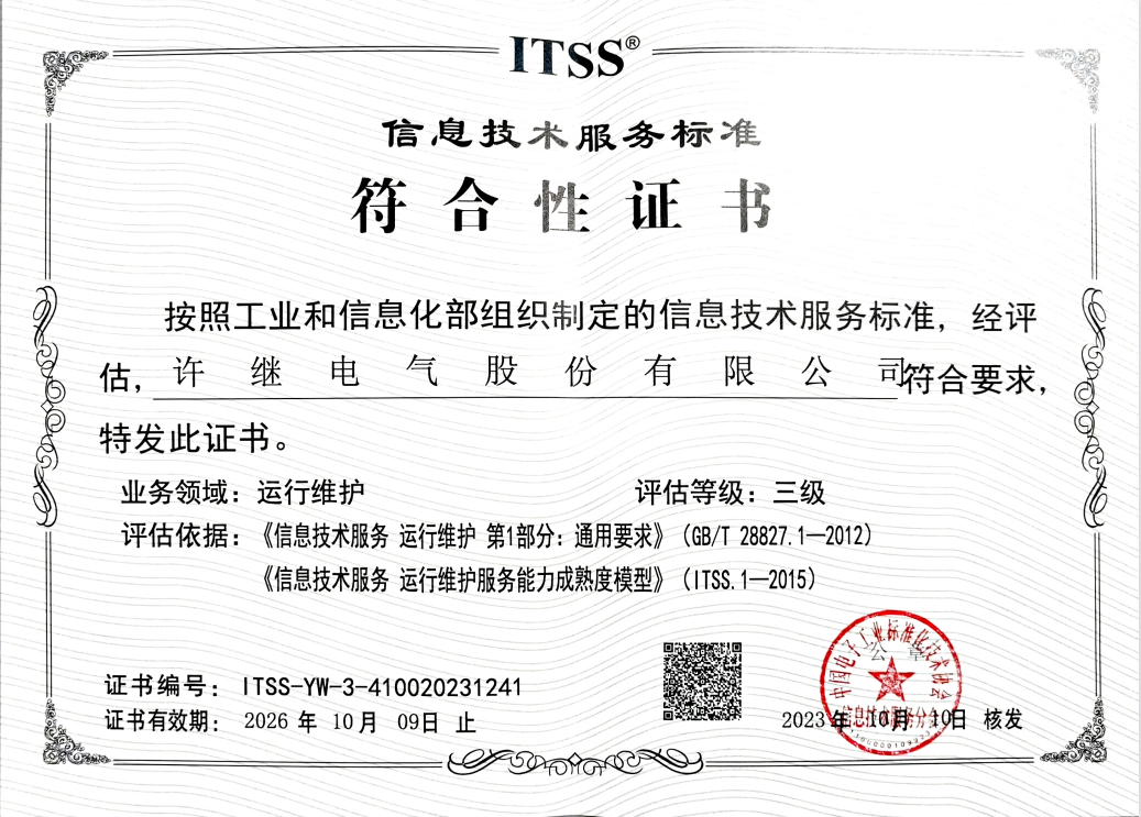 此次,许继电气顺利通过ITSS三级认证,充分证明公司已具备专业化、系统化的信息技术服务能力,充分体现了公司在运维服务领域的综合实力,可有效为各用户提供更安全、更稳定、更高效的信息技术服务。