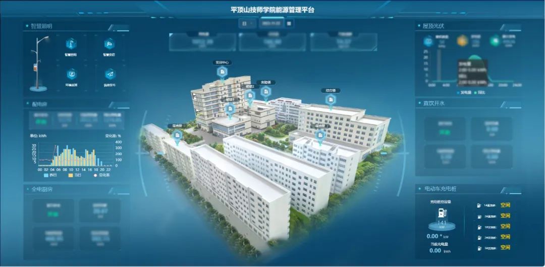 该项目是平高集团承建的首个微型碳中和示范性学院项目,通过能源管控系统和能源物联网等综合能源核心产品在高校的应用,开展屋顶分布式光伏、智慧路灯、智慧充电、全电厨房等建设,建成综合能源仿真实训平台,在满足低碳用能的同时降低学院能耗支出,助力学校相关学科专业建设。通过项目建设,为学院电气、通信等专业学生打造教学示范、业务模拟、实践操作等功能的实训基地。
