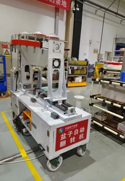 近期,中国西电所属西开有限结合新园区自动化产线建设,在电气测控产品线电压互感器盆子分装工位投入了盆子自动翻转工装,并已成功在产线上线使用。该工位人员在盆子分装完成后需采用吊车、吊绳进行人工翻转,翻转过程较为繁琐且效率低下,该盆子自动翻转工装上线后,装配人员可直接将盆子固定在夹爪上进行分装作业,完成后操作控制按钮即可实现盆子的自动翻转,从而进行后续装配作业,实现了盆子翻转的自动化、精准化和高效化。