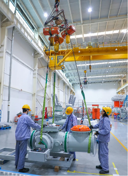 伴随着警笛声,挑高20米的无尘车间内,行车伸出强有力的“手臂”将零部件吊装至适宜高度,根据工人装配需求,进行多角度旋转。这样“人机共舞”忙碌的景象正在厦门许继高压生产车间中上演。