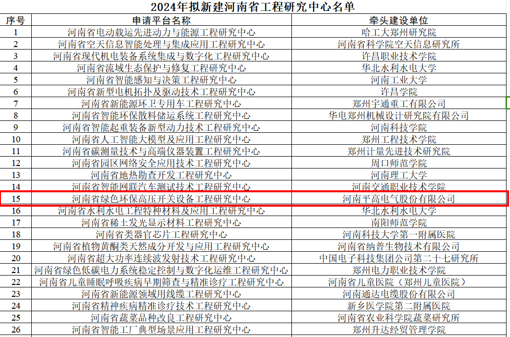 近日,河南省发展和改革委员会发布的“2024年度拟新建河南省工程研究中心”名单公示结束,由平高电气牵头建设的“河南省绿色环保高压开关设备工程研究中心”成功获批,这标志着公司在科技体制改革、科技创新体系建设方面迈向一个新台阶。