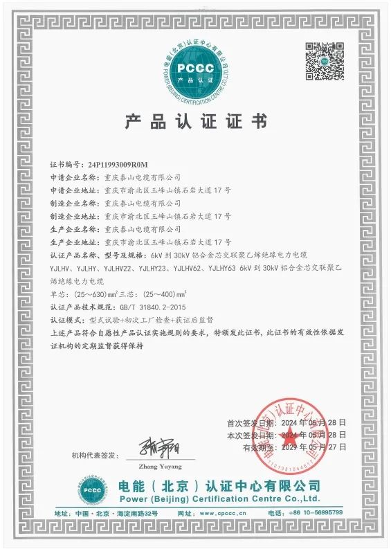 顺利通过电能产品认证,是对企业整体运行管理水平的肯定和促进,为泰昇品牌在电力系统市场广泛应用和发展奠定了坚实基础,以及在行业中的领先优势和市场持续竞争力。目前为止,泰山电缆相继获得环境管理体系、质量管理体系、职业健康安全管理体系、绿色设计产品评价认证、售后服务五星认证、社会责任管理体系认证等多个认证证书。